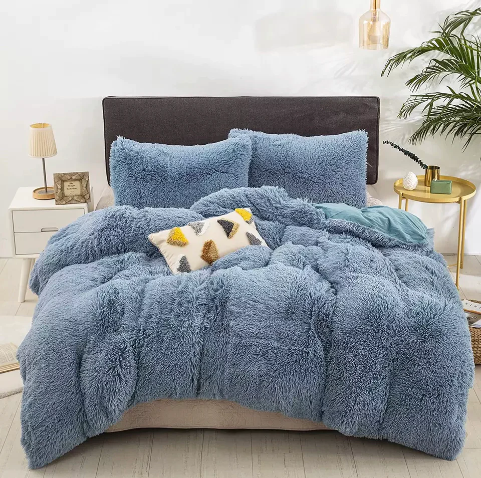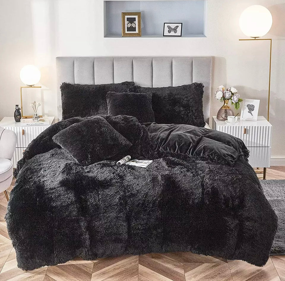 SIZE : Twin,Full,Queen,King SIZE INFORMATION: Twin:1 pc duvet cover 66"x90", 1 pc pillow sham 20"x26". Queen:1 pc duvet cover 90"x90", 2 pcs pillow shams 20"x26". King:1 pc duvet cover 104"x90", 2 pcs pillow shams 20"x36" MATERIALS: Both duvet cover and pillow shams are made from 100-percent polyester microfiber plush shaggy reverse to ultra soft faux suede crystal velvet fabric, gives the room an affluent and complete look. Resistance to fade, wrinkles and pilling. Plush shaggy quilt cover and decorative throw pillowcases could be sold separately in our store. CRAFT: Hidden zipper closure on the back of the pillowcases and on the bottom of the duvet cover, easy to clean, ties inside to hold quilt securely in corners. CARE INSTRUCTION: Machine wash cold on gentle cycle. Tumble dry low or dry flat. Do not bleach. Do not Iron. Avoid hang dry which will cause deformation, comb the fleece to regain fluffiness and smoothness after washing. 30 days return and replacement. Any problem, please contact us to get a satisfied solution.